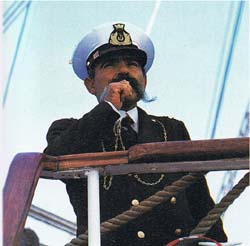 E’ il nostromo (…) lo si trova in piedi vicino alle pazienze dei vari alberi, con la sua formidabile arma, un fischietto di metallo lucido e a bulbo, dal quale ricava sinfonie, concerti di fischi modulati dall’altissimo al basso secondo la sua volontà e ispirazione, un vero Paganini del sifolo”.